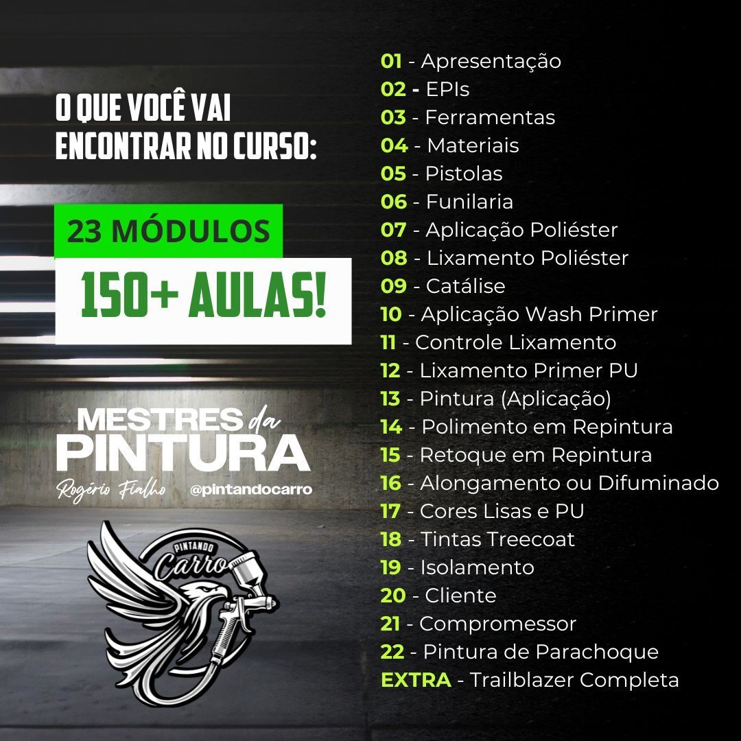Você precisará de ferramentas básicas de pintura automotiva, como pistolas, lixas, primers, tintas e EPIs. O curso inclui módulos específicos para te guiar na escolha dos melhores materiais para cada nível de experiência e para cada tipo de serviço também.